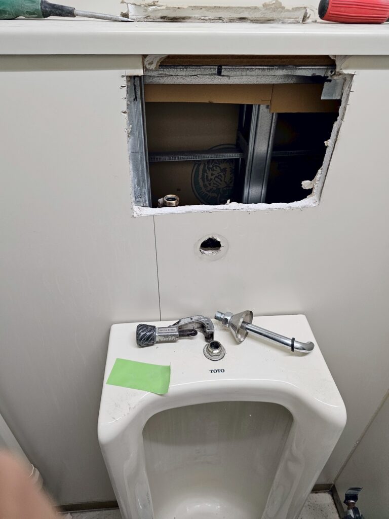 経年劣化により汚れの付着や作動不良が見られた既存の小便器を撤去し、新しい小便器へ交換しました。
