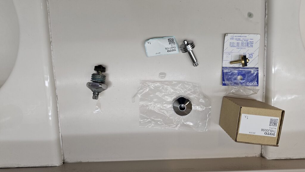 点検の結果、内部のスピンドルやパッキンが劣化しており、TOTO純正部品を使用して交換対応を実施。